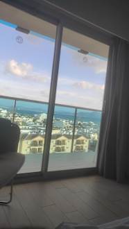Der Blick vom Bett auf das Meer am morgen.