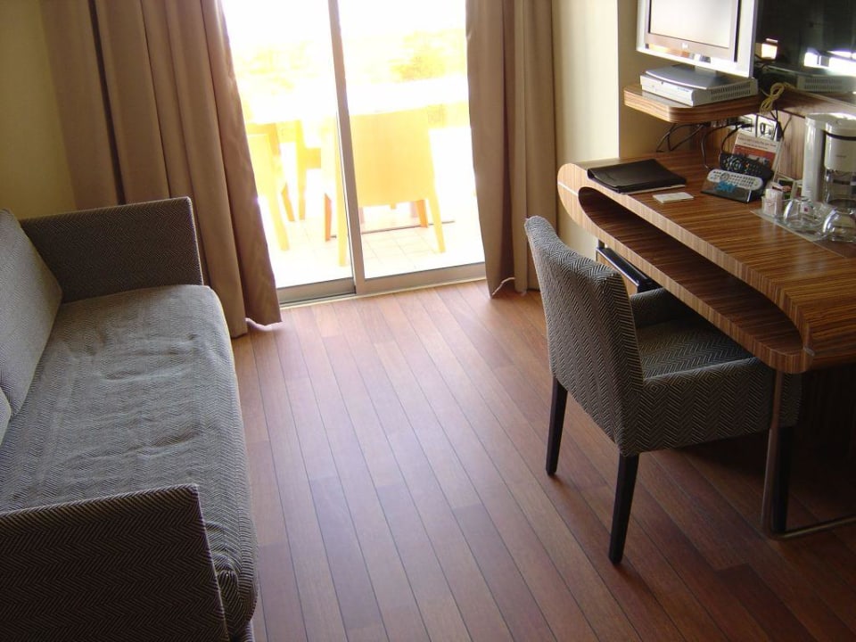 Der Aufenthaltsraum in der Feeling-Suite mit dem Auszugssofa auf der linken Seite welches der 3. + 4.Peson als Bett ausgezogen werden kann.