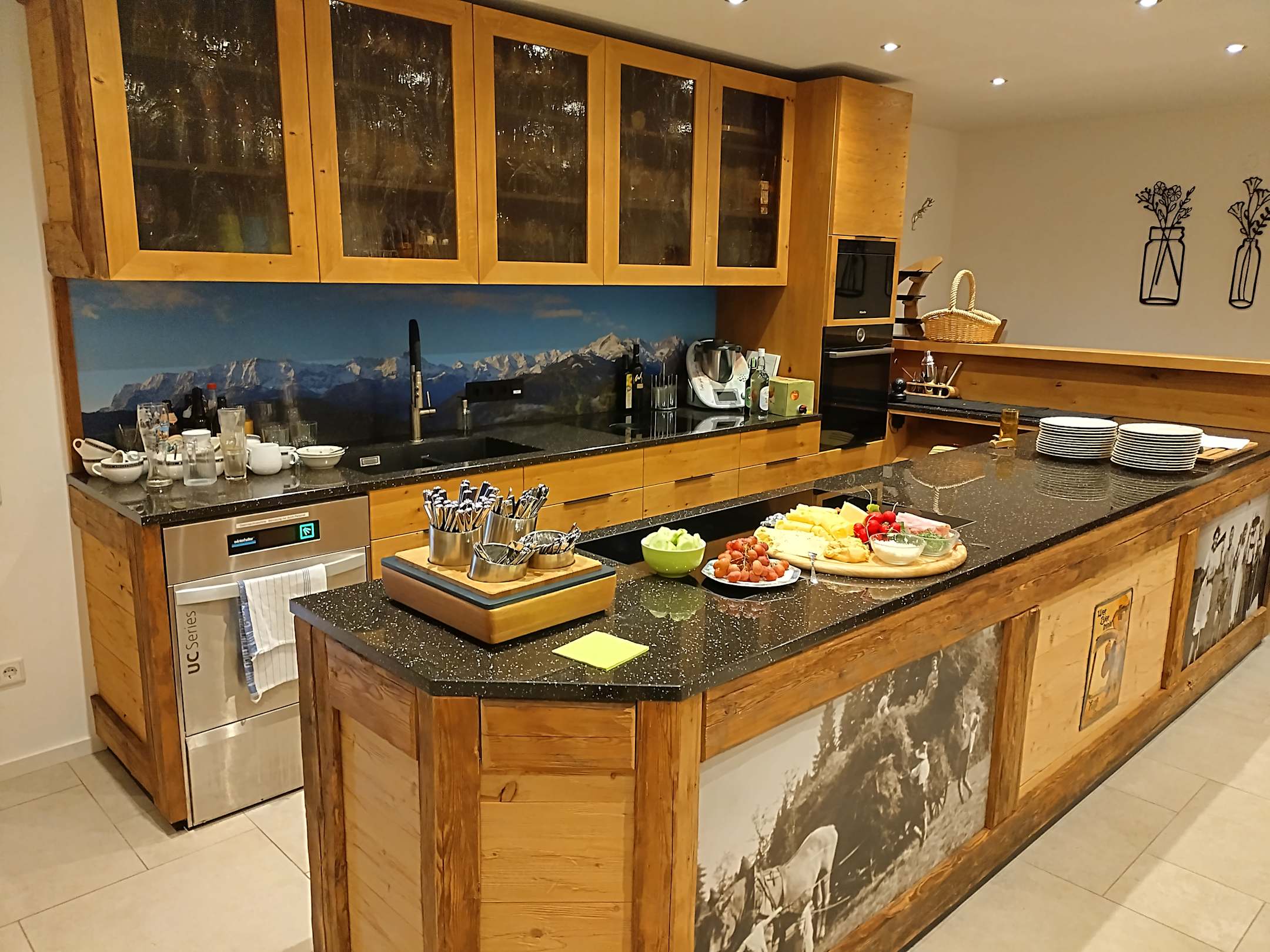 Die wunderschöne Küche im Gemeinschaftsraum. (Die Brotzeit wird gerade aufgetischt. (Es fehlt hier noch einiges auf dem Foto, das nach und nach dazu kam ;-).)