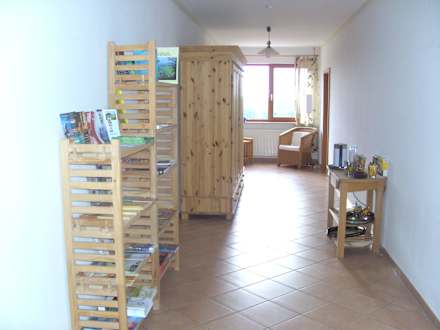 Hotelflur mit Prospektmatererial und Teebar