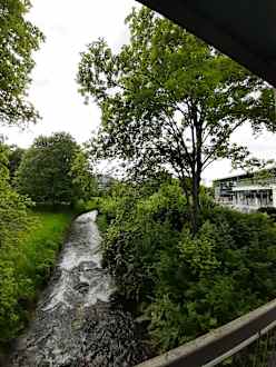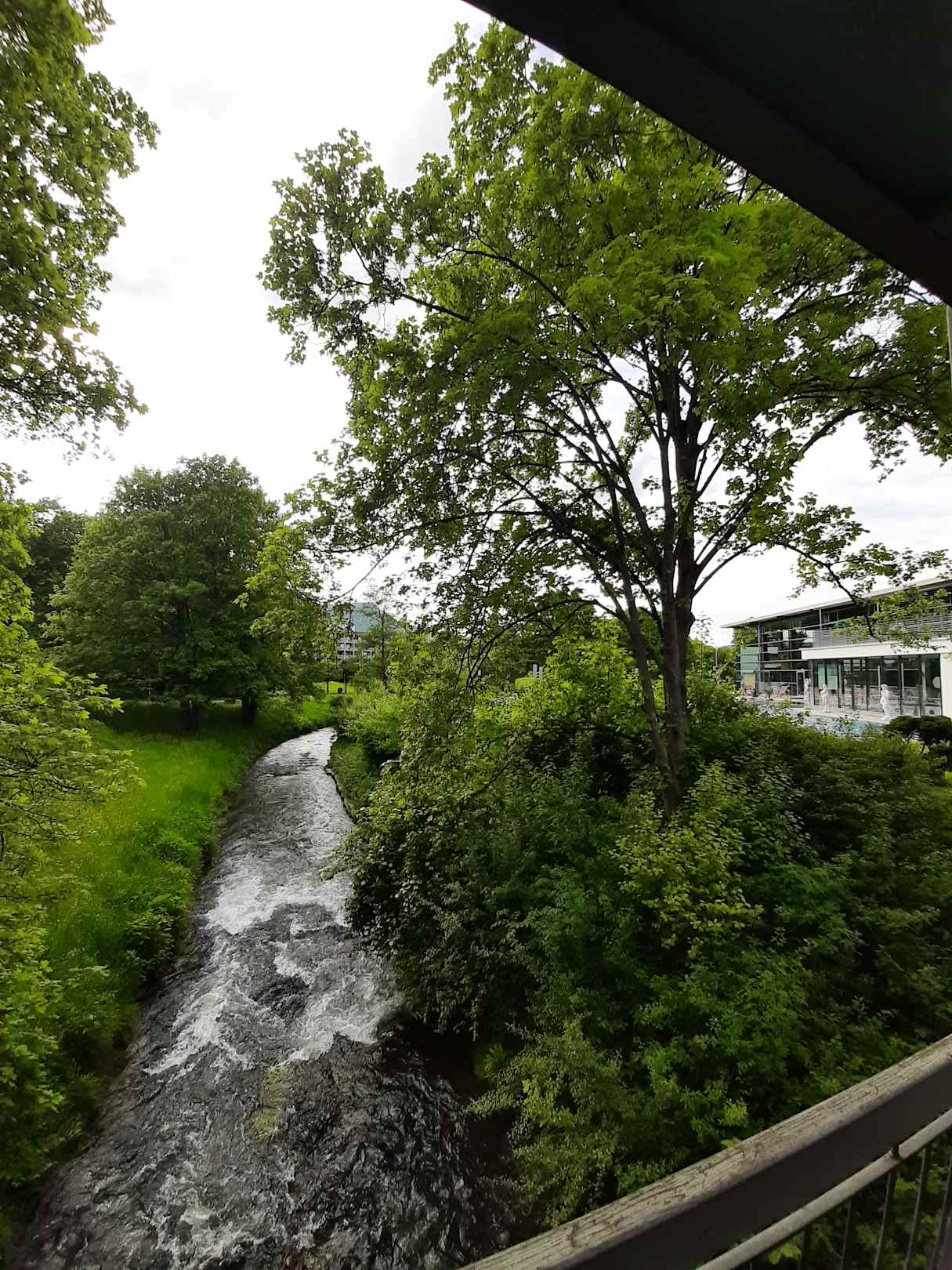 Blick aus dem schönen Wintergarten auf die Erms und die Therme