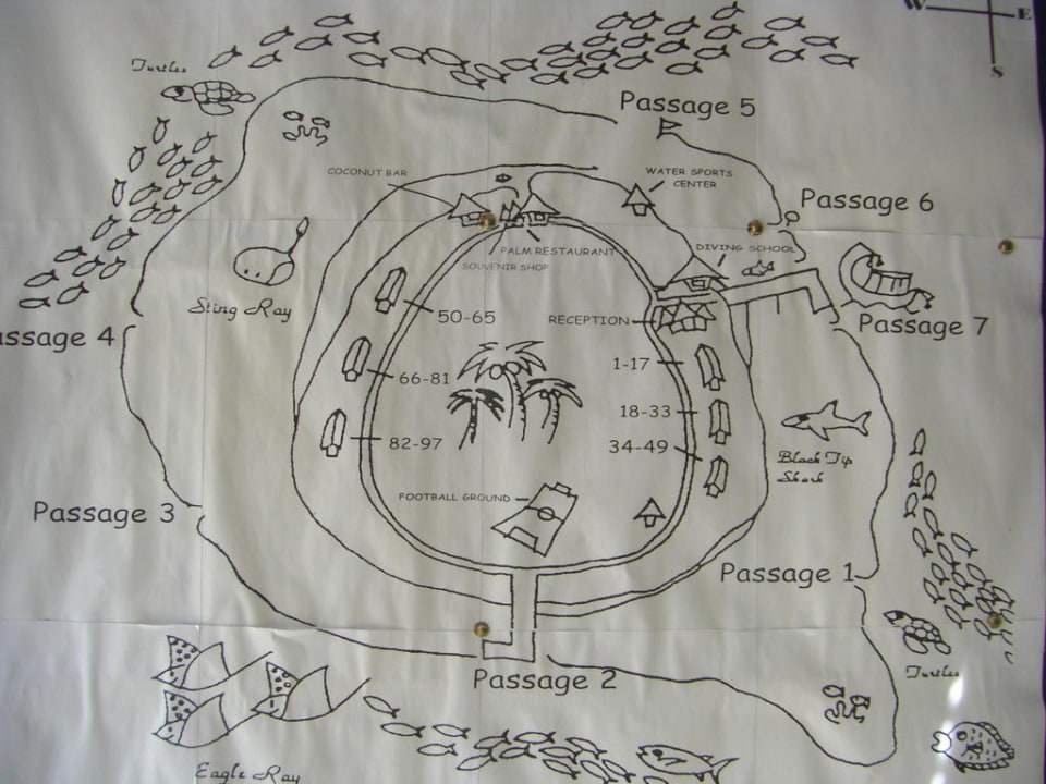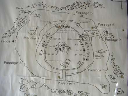 Inselplan mit Zimmernummern und Einstiege zum Schnorcheln.