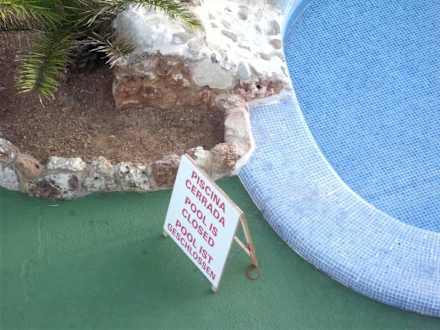 Blick zu geschlossenem Pool und Wasserfall