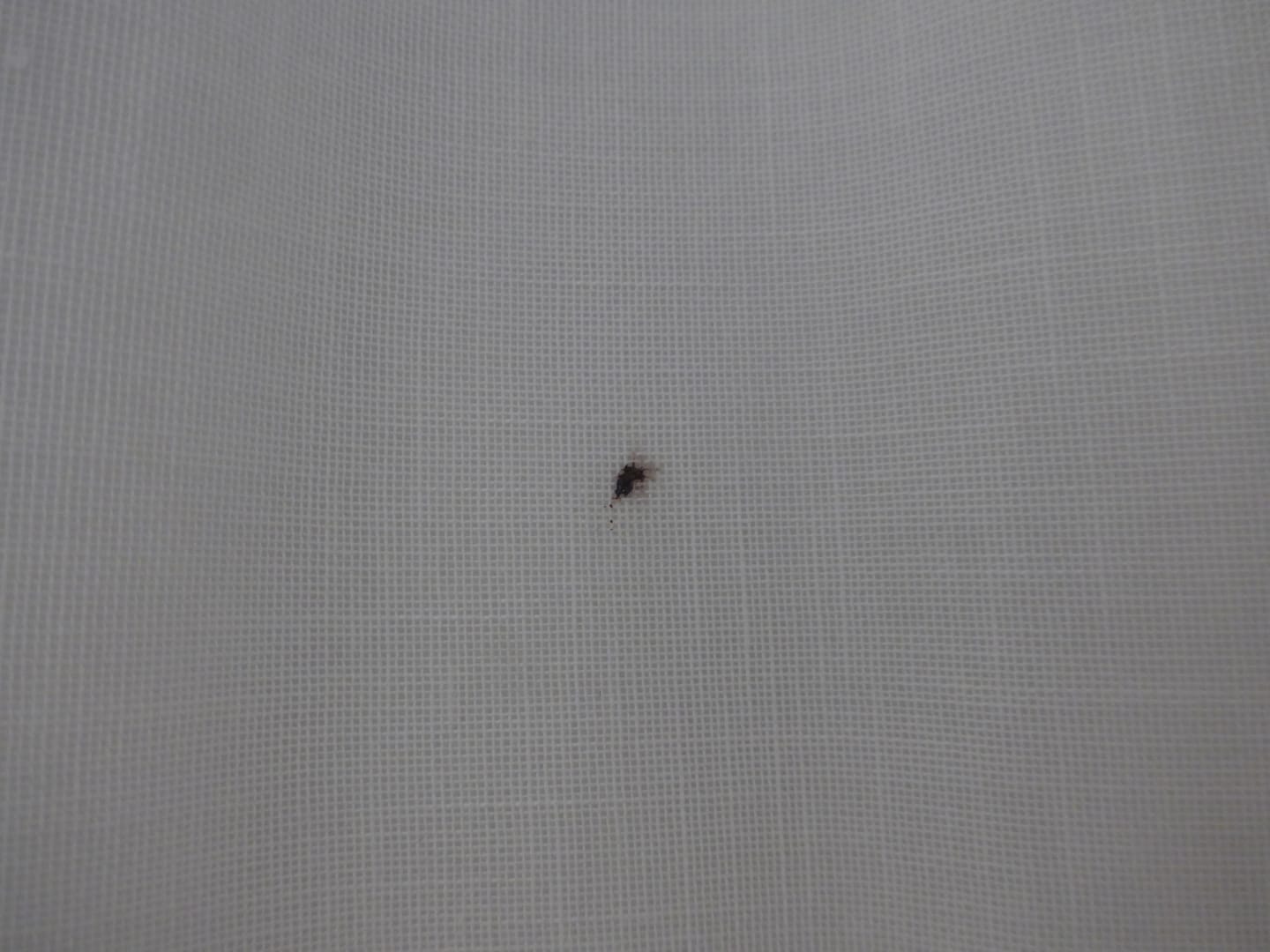 Schwarze/blutrote Flecken von erschlagenen Mücken an Gardinenstoffen bei Bezug des Zimmers.