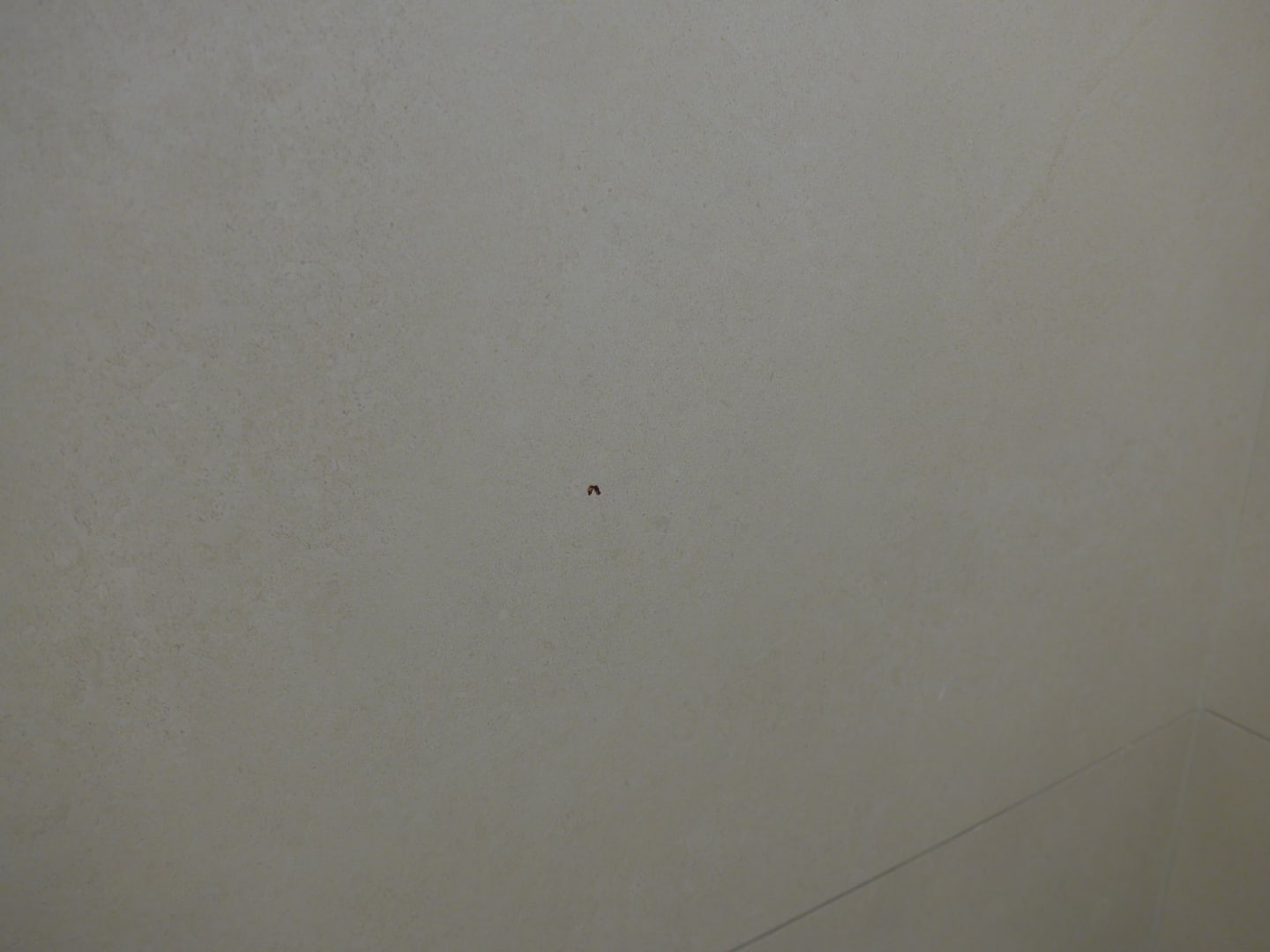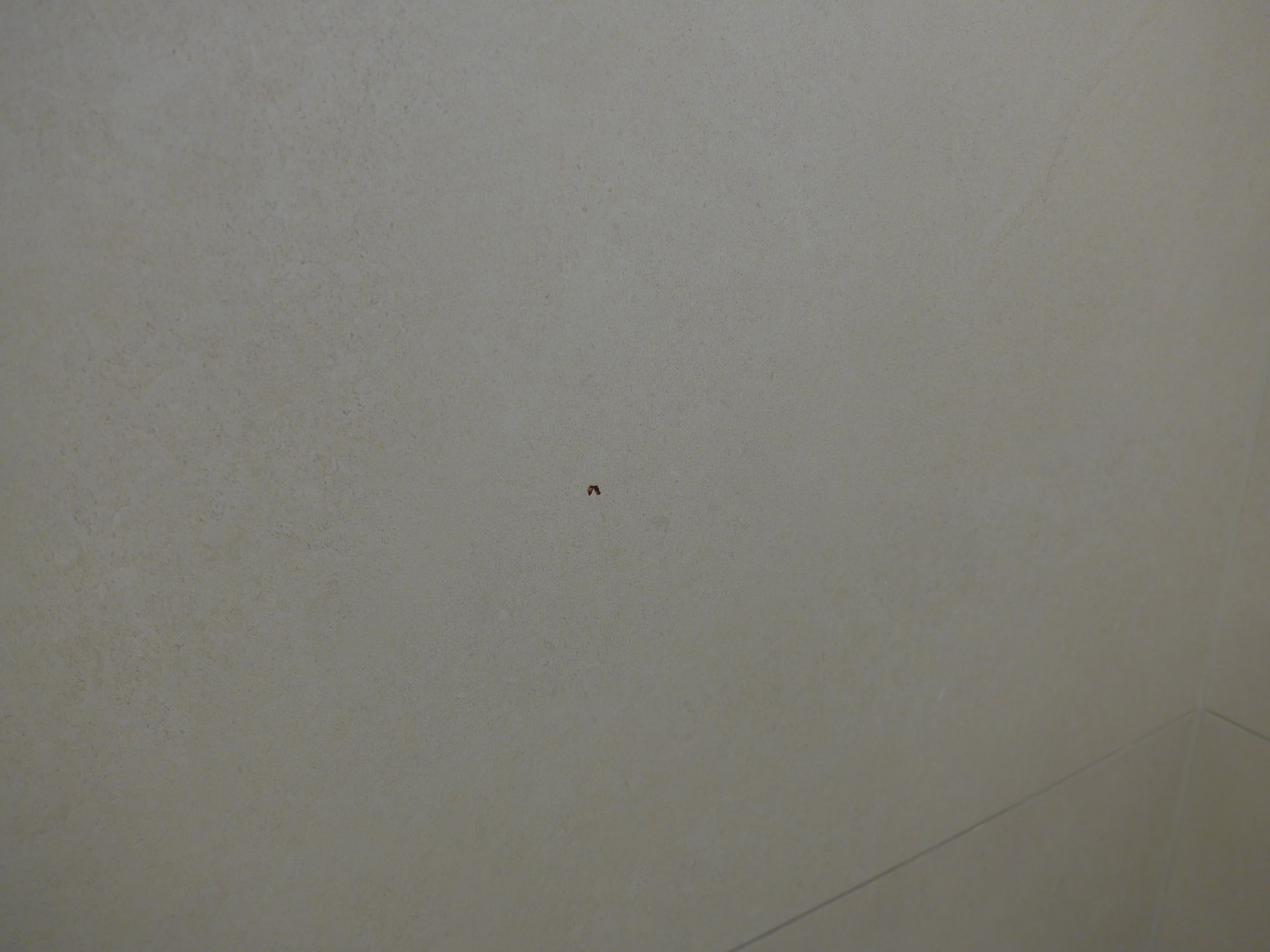 Schwarze/blutrote Flecken von erschlagenen Mücken an den Badezimmer-Fliesen bei Bezug des Zimmers.