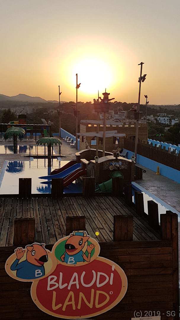 Traumhafter Sonnenuntergang am Schwimmbad "Blaudi Land" sowie Splash Pool mit Rutschbahnen #BlauPuntaReinaResort #CalaMandia #BlauHotelsExperience #Holidays #Mallorca #Espana