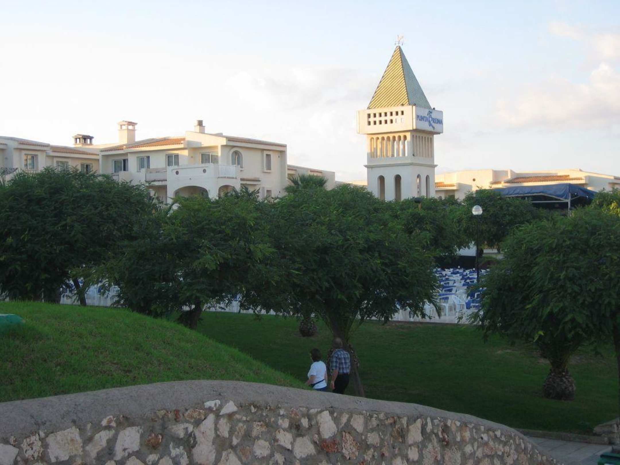 Die Spitze des Hotels, die man von Weiten her sehen kann. Links sieht man die Bühne und hinter den Bäumen befindet sich die Abendterasse, von wo man das Programm auf der Bühne verfolgen kann.