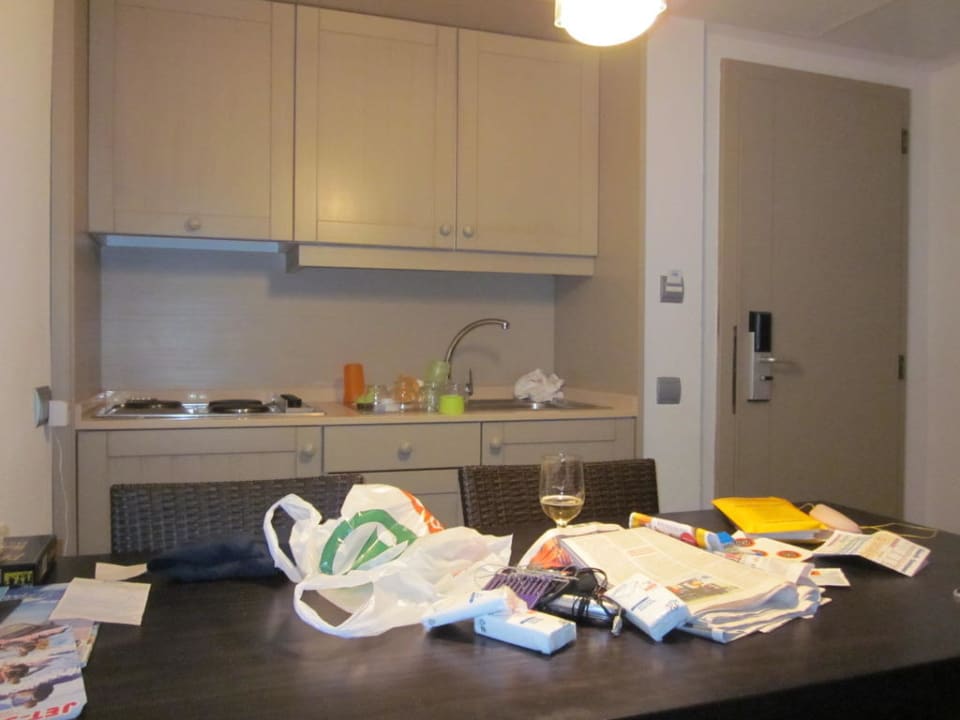 Küchenzeilekleine Kochnische, mit Kühlschrank, Waschbecken, Geschirr, es wurde aber lediglich der Kühlschrank genutzt, da wir AI gebucht haben.