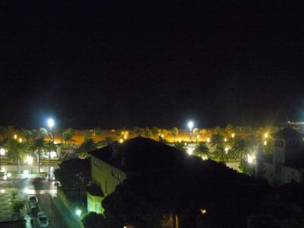 Blick vom Balkon abends auf Strand und Promenade