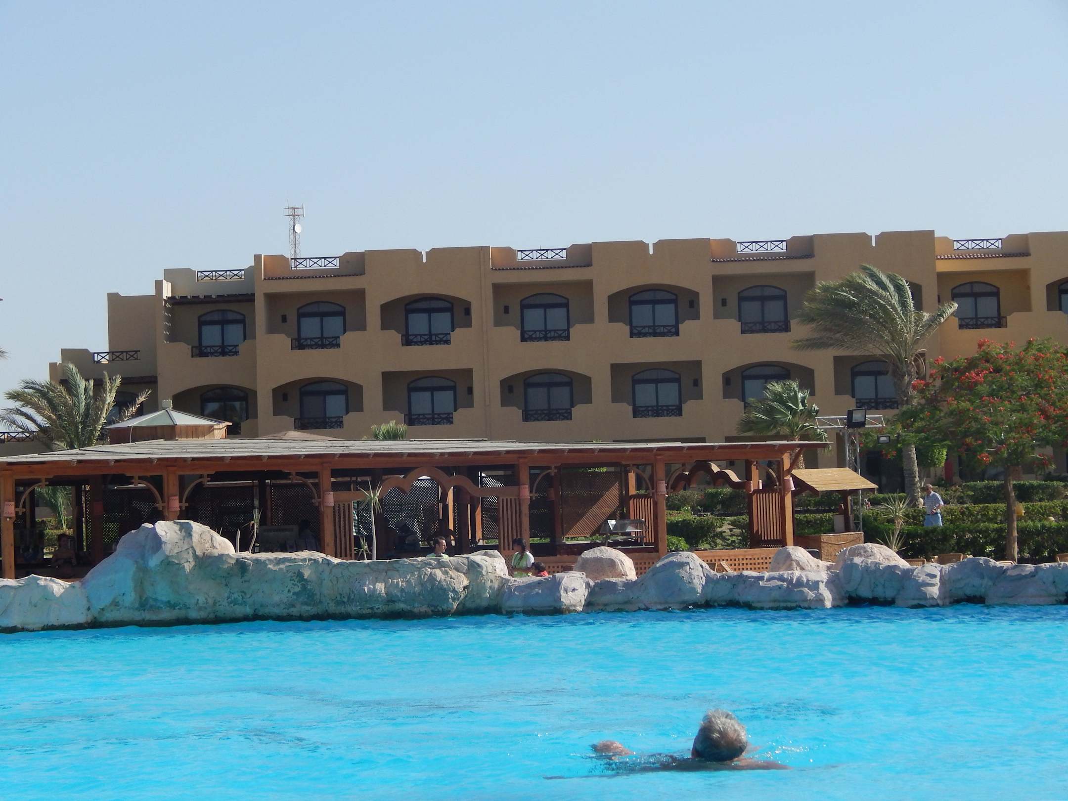 Pohled přes bazén k baru