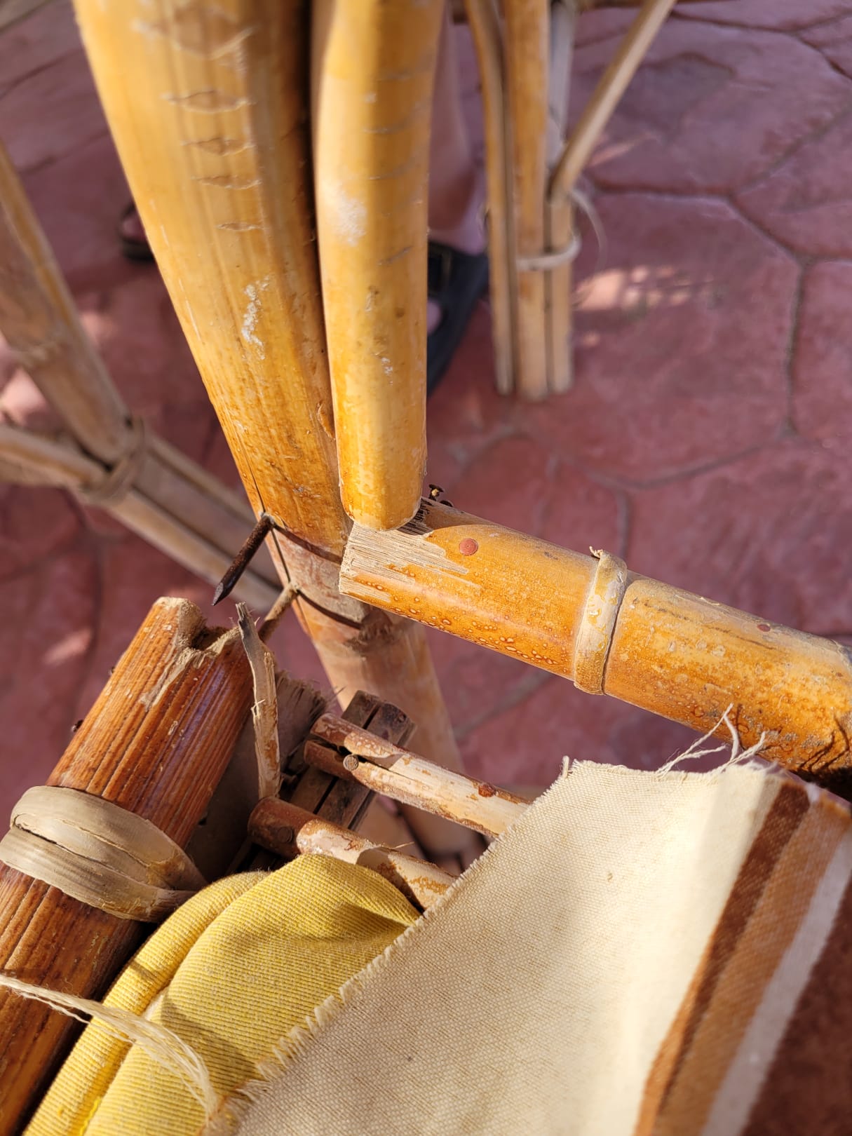Stuhl an der Strandbar, rosige Nägel und zerrissene Polster