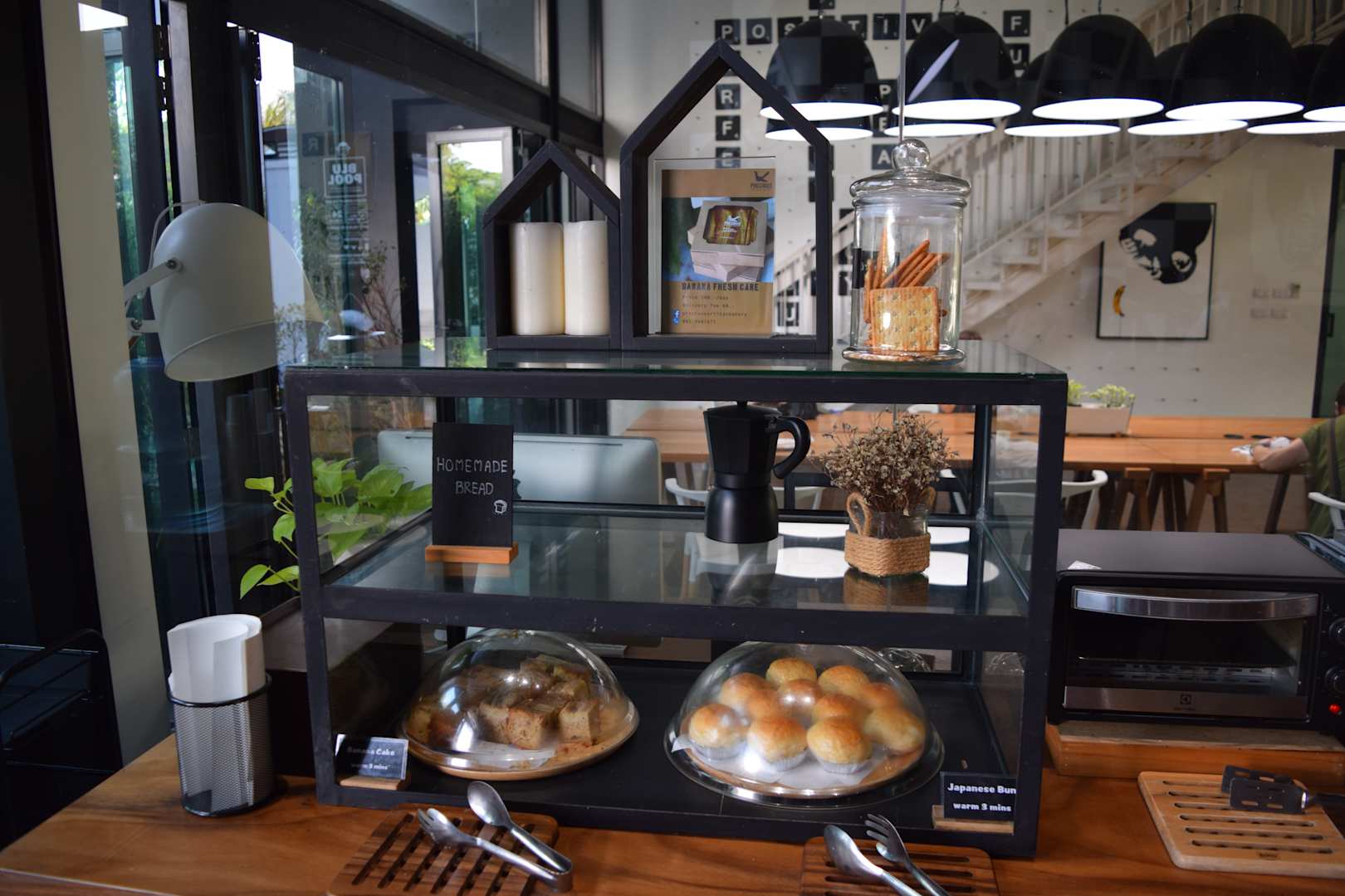 Frühstück in Buffet-Form (Teilansicht), Bananen-Kuchen und JFrühstück in Buffet-Form (Teilansicht), Bananen-Kuchen und Japanische Brötchen