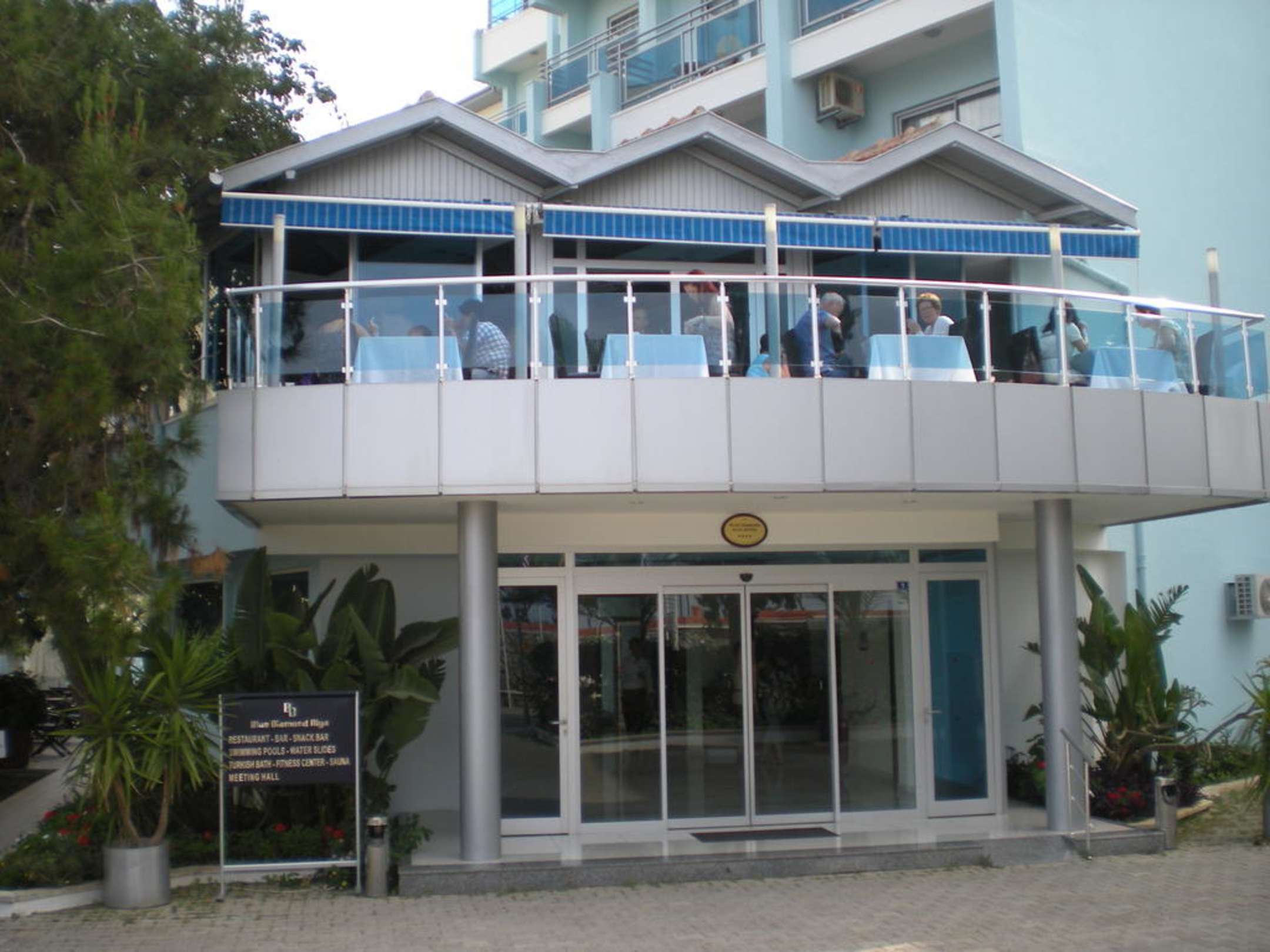 Eingang des Hotels und darüber der Aussenbereich vom Restaurant.