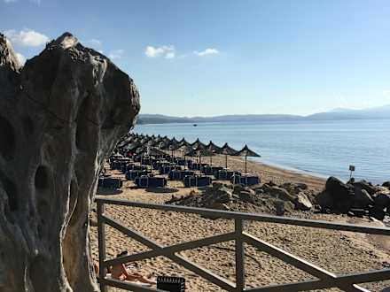 Blick von der Beachbar auf den hoteleigenen Strand. 2 Liegen mit Schirm kosten 4,50 EUR pro Tag. Das Wasser war sauber und warm, der Sand relativ fein.