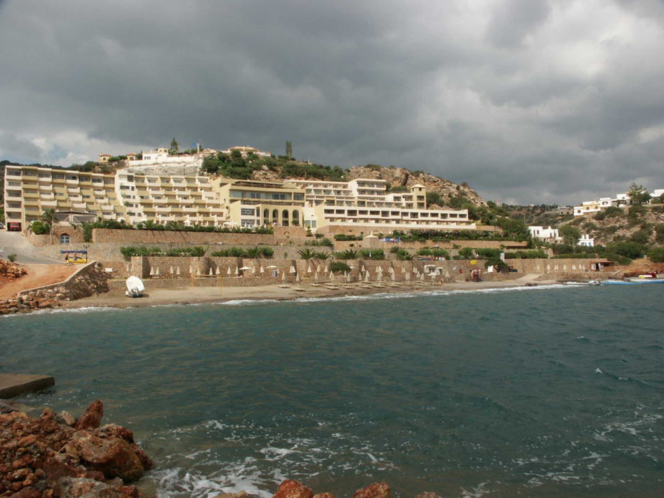 Blick von der kurzen Mole auf die gesamte Hotelanlage inkl. Strandbereich