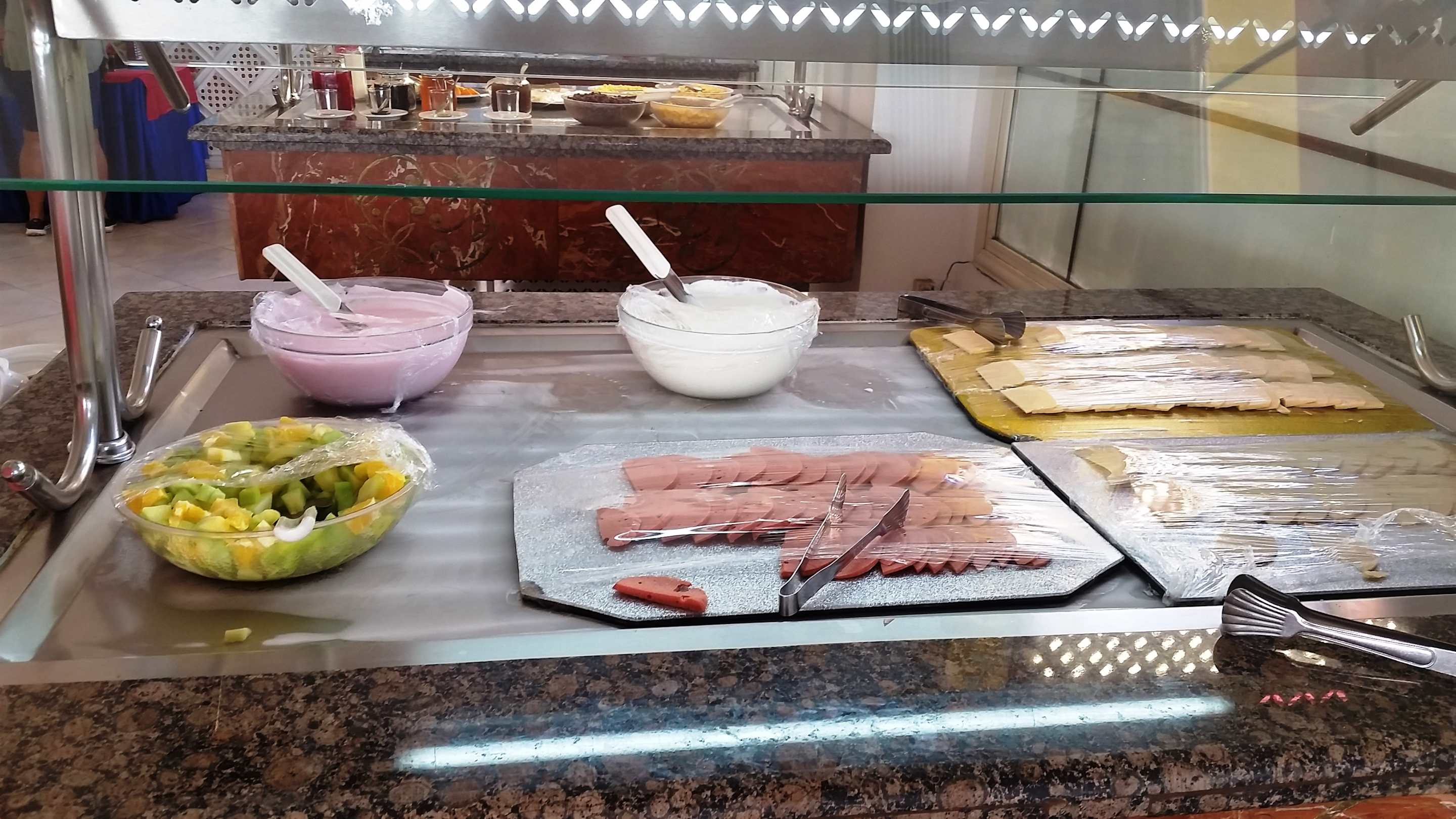 Frühstück - Obstsalat, Joghurt, Wurst und Käse. Butter gibt es beim Eierbrater.
