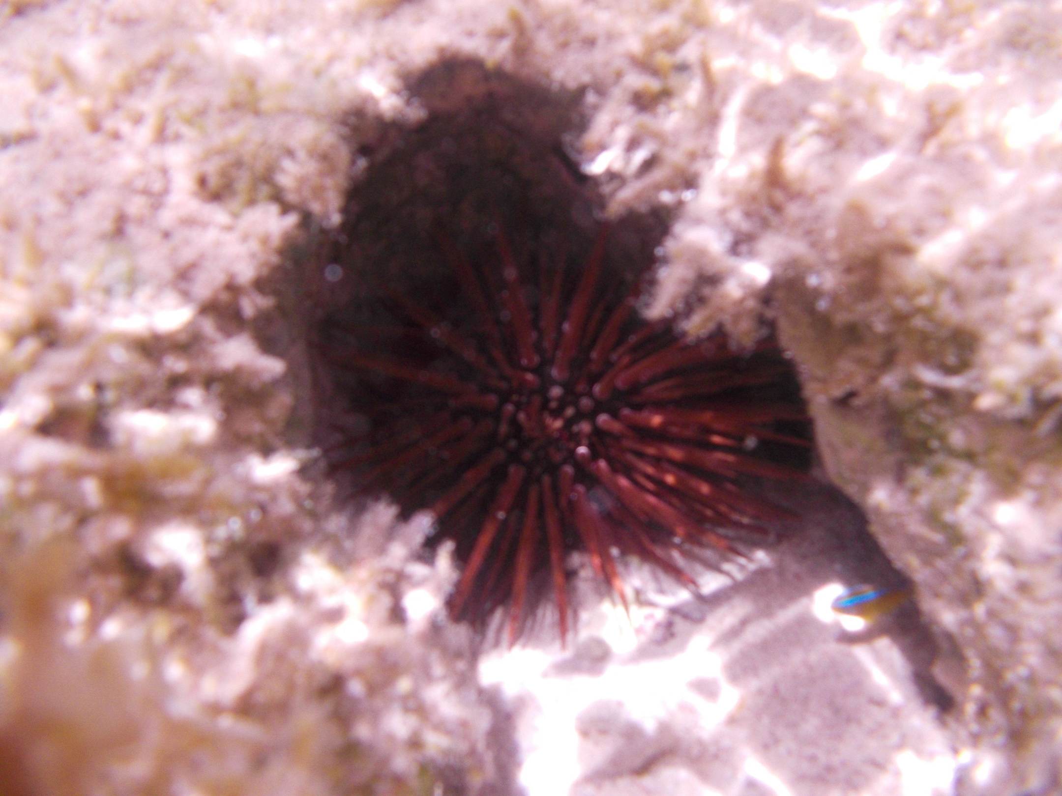 Un riccio di mare incastrato nei coralli