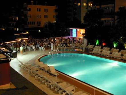 Blue Star Hotel am AbendBild vom Balkon unseres Zimmers geschossen während das Animationsprogramm neben dem Pool läuft.