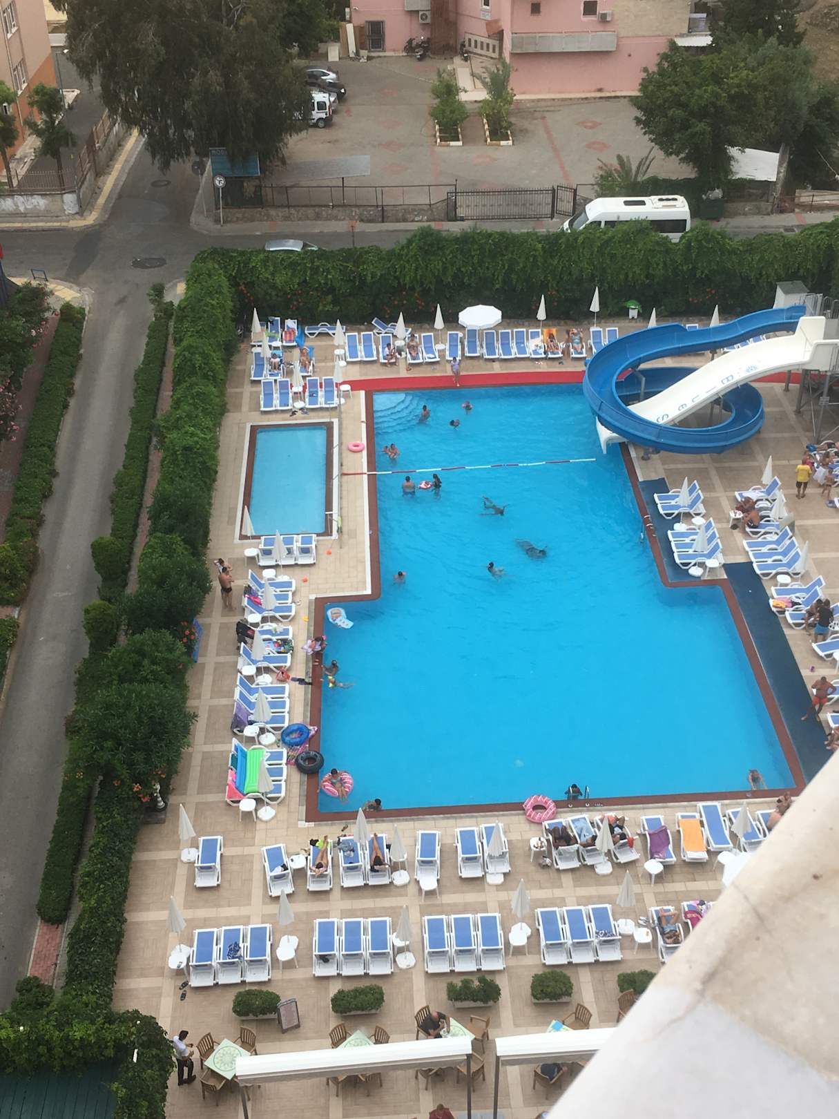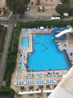 Seitlich vom Balkon auf den Pool aus dem 8.Stock