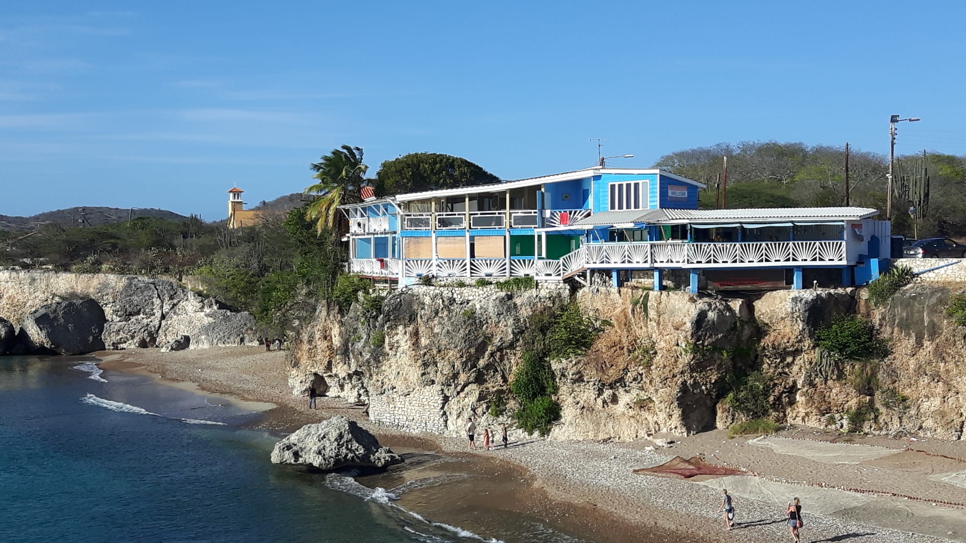 Blick vom südl. Buchtrand: App. mit Restaurant im Vordergrund