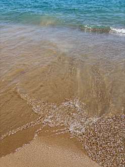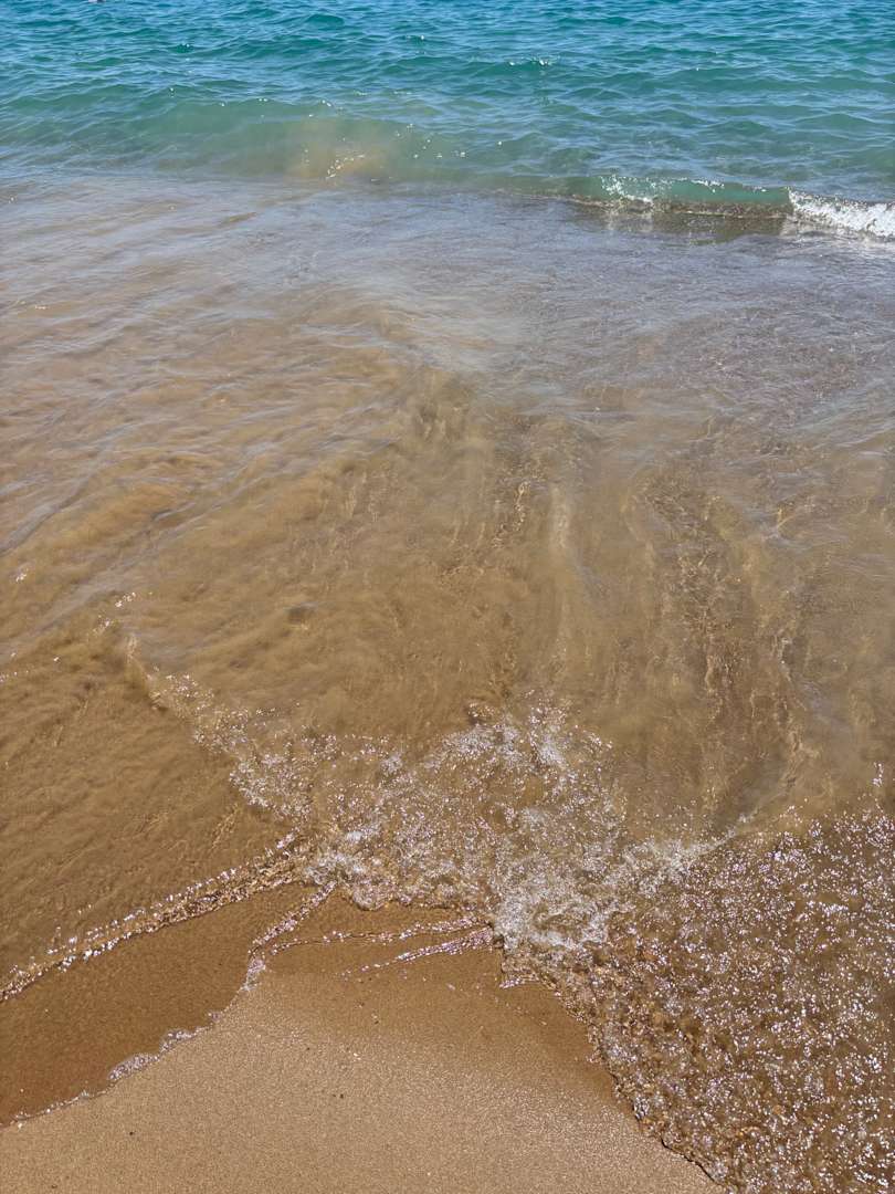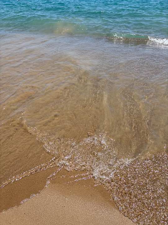 StrandFlach abfallender Strand. Man kann so knapp 10 Meter reinlaufen und noch stehen. „Bricht nicht ab“