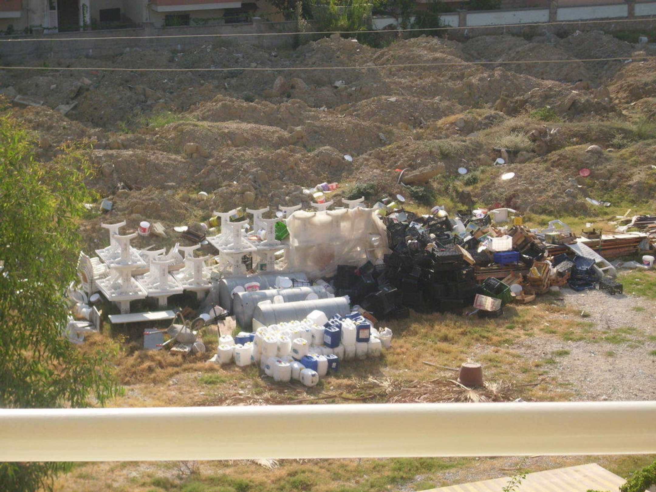 Müllheide, Kisten Tische, Stühle erkennbar....