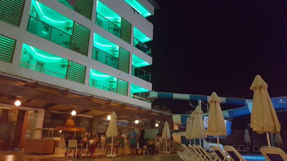 Blick vom Pool aufs Hotel