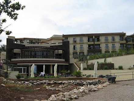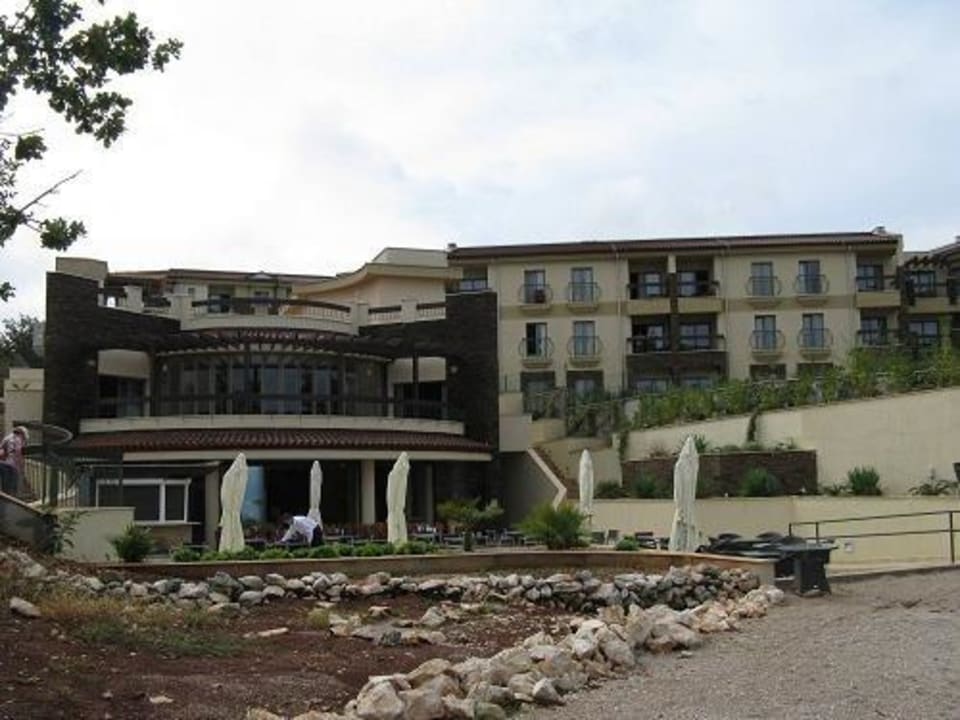 Das Bild zeigt das Hotel vom Strand aus. Links unten der Speisesaal, darüber das ala-Card-Restaurant und darüber die Poolbar. Rechts die Zimmer in der Außenansicht.