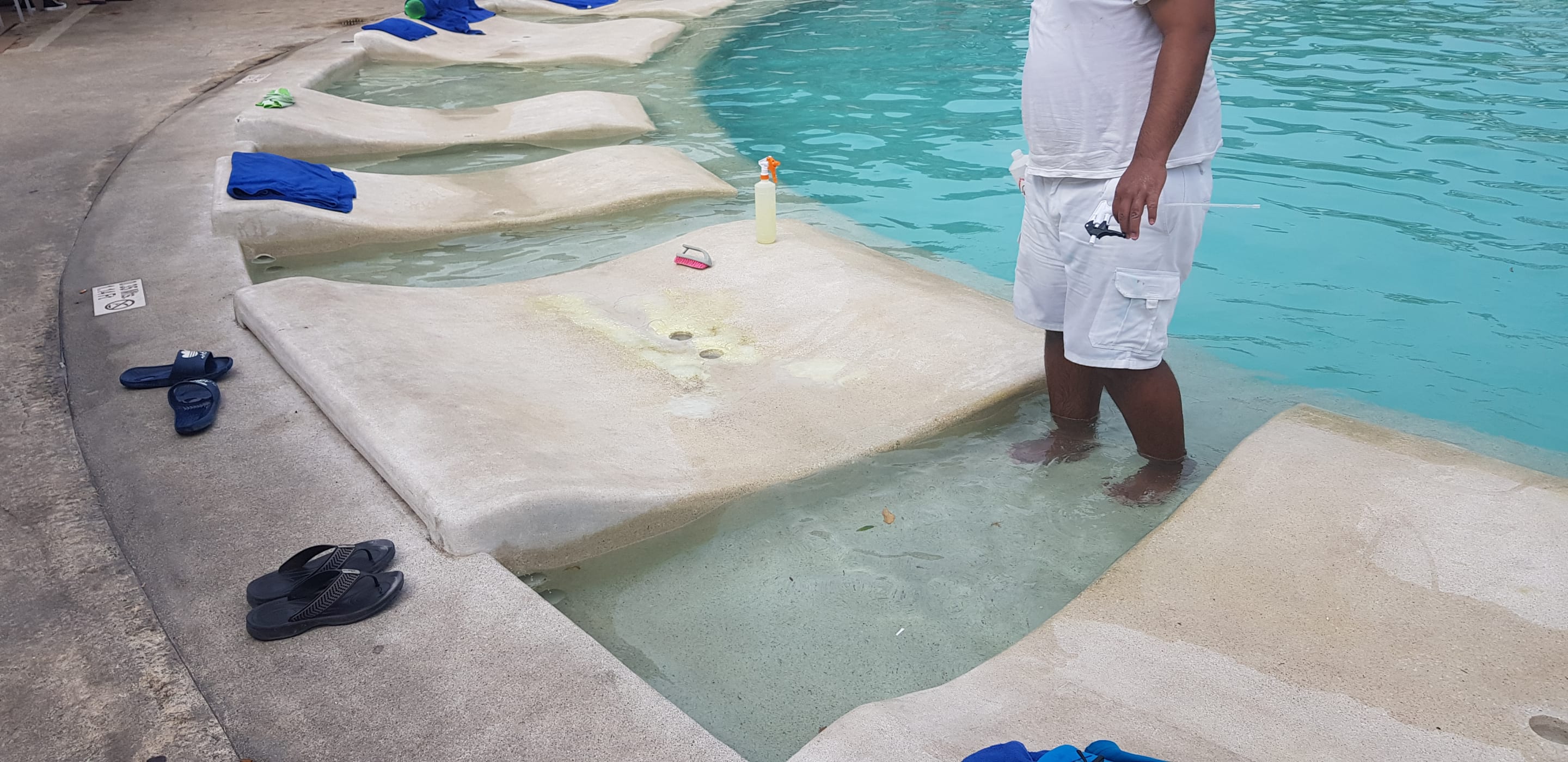 In den Pool. Und das jeden Tag. Auf der Flasche sind mehrere Gefährdungen für Mensch und Tier eingezeichnet. Dies ist Umweltverschmutzung und nicht hinnehmbar für Personal und Gäste