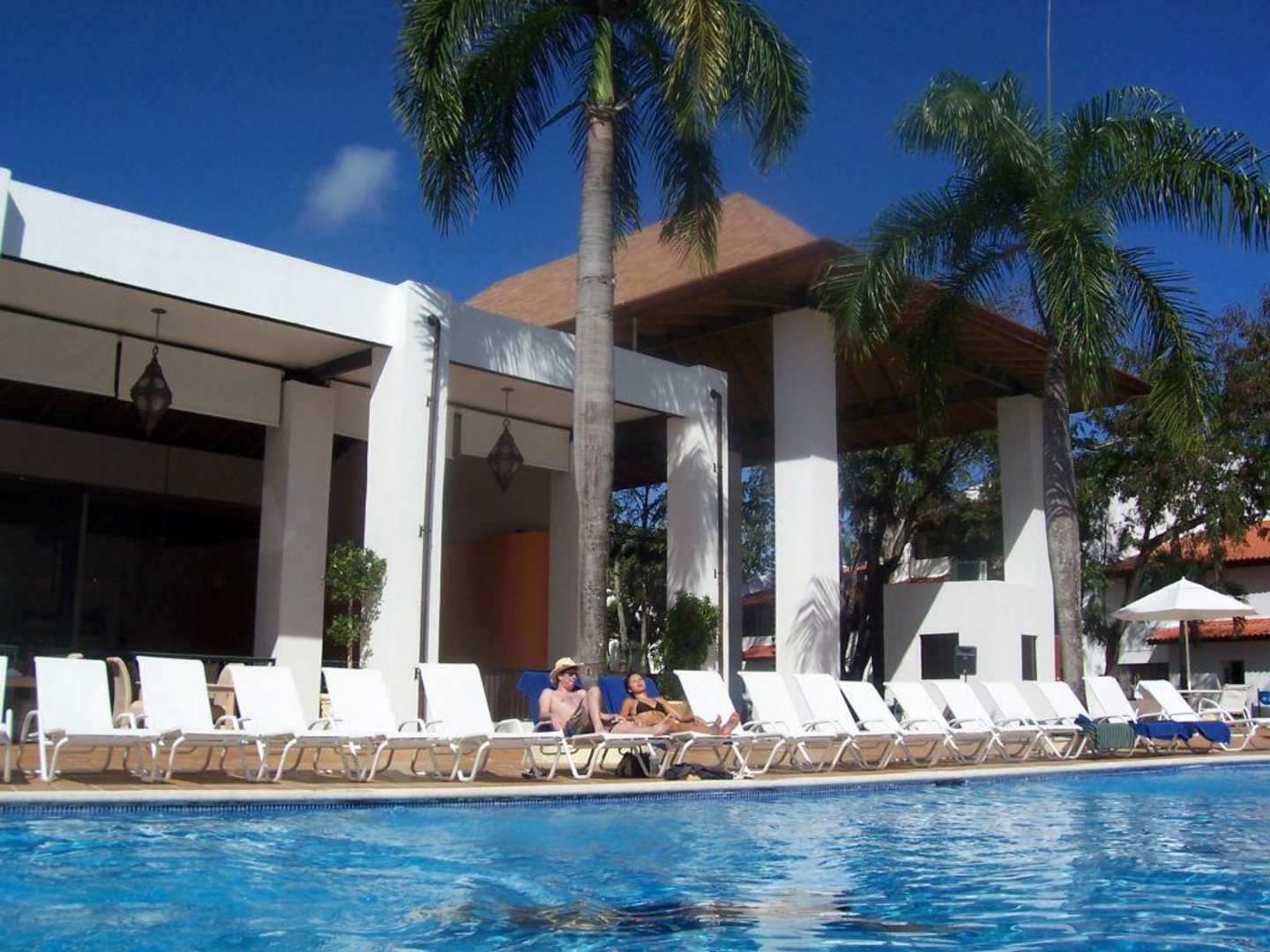 Blick über den 2. zentralen Pool auf das Büffet-Restaurant und den vorderen Teil des überdachten Bereichs für die Abendunterhaltung.