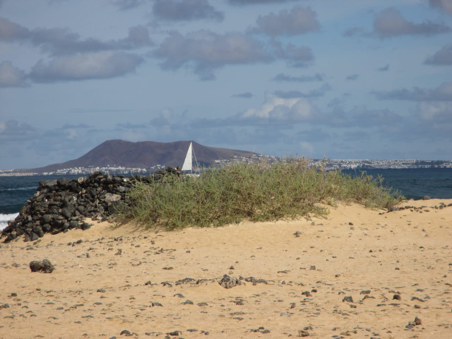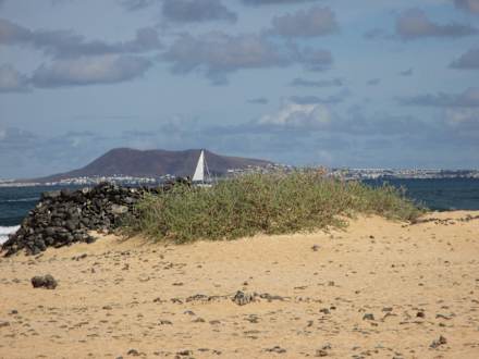 Strand, im Hintergrund die Insel Lobos