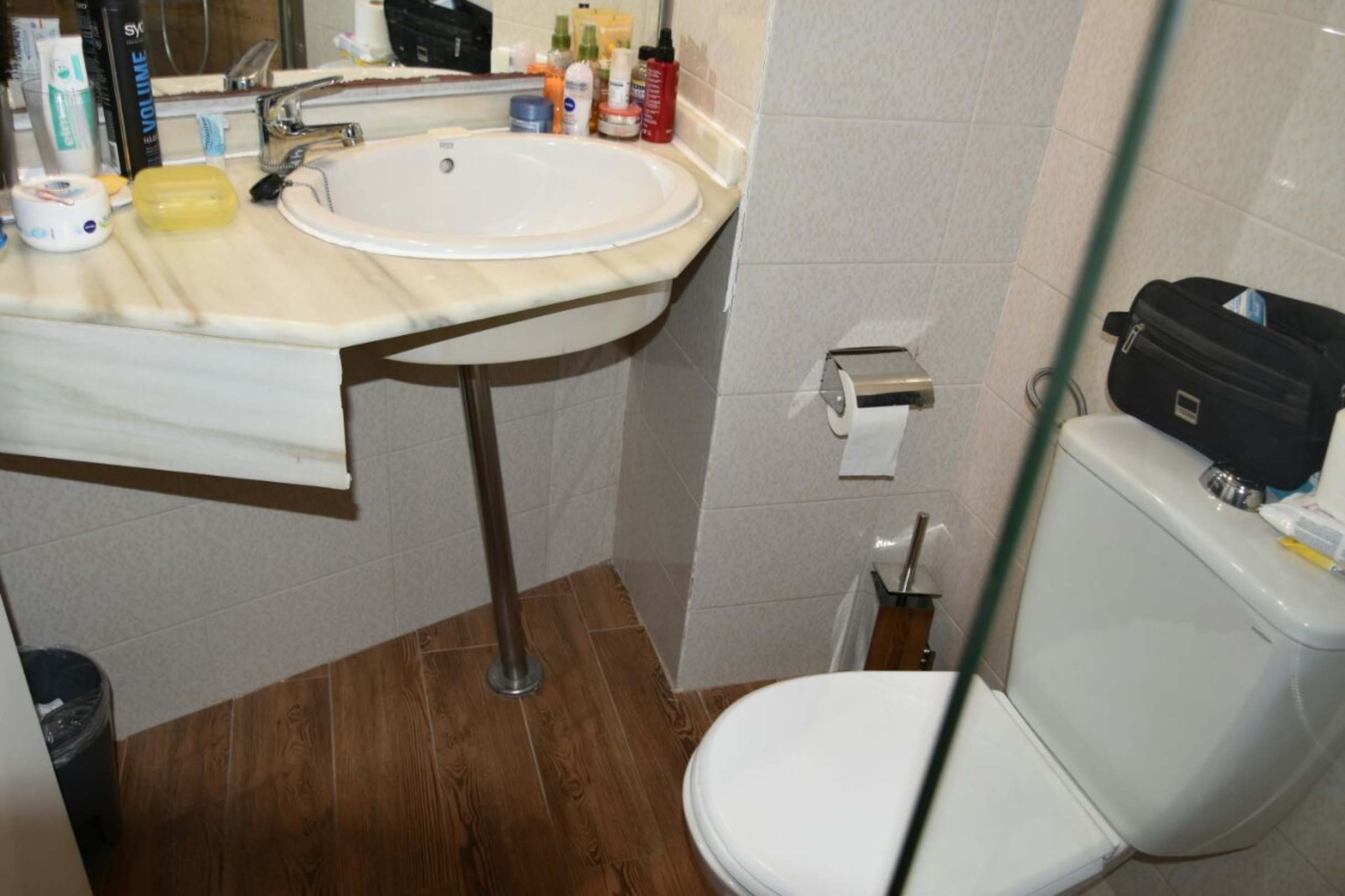 ZimmerBad. Hier sehr eng. Aus Platz Grund wurde schon unter dem Waschtisch eine Verkleidung weg gebrochen. Scharf Kantig.