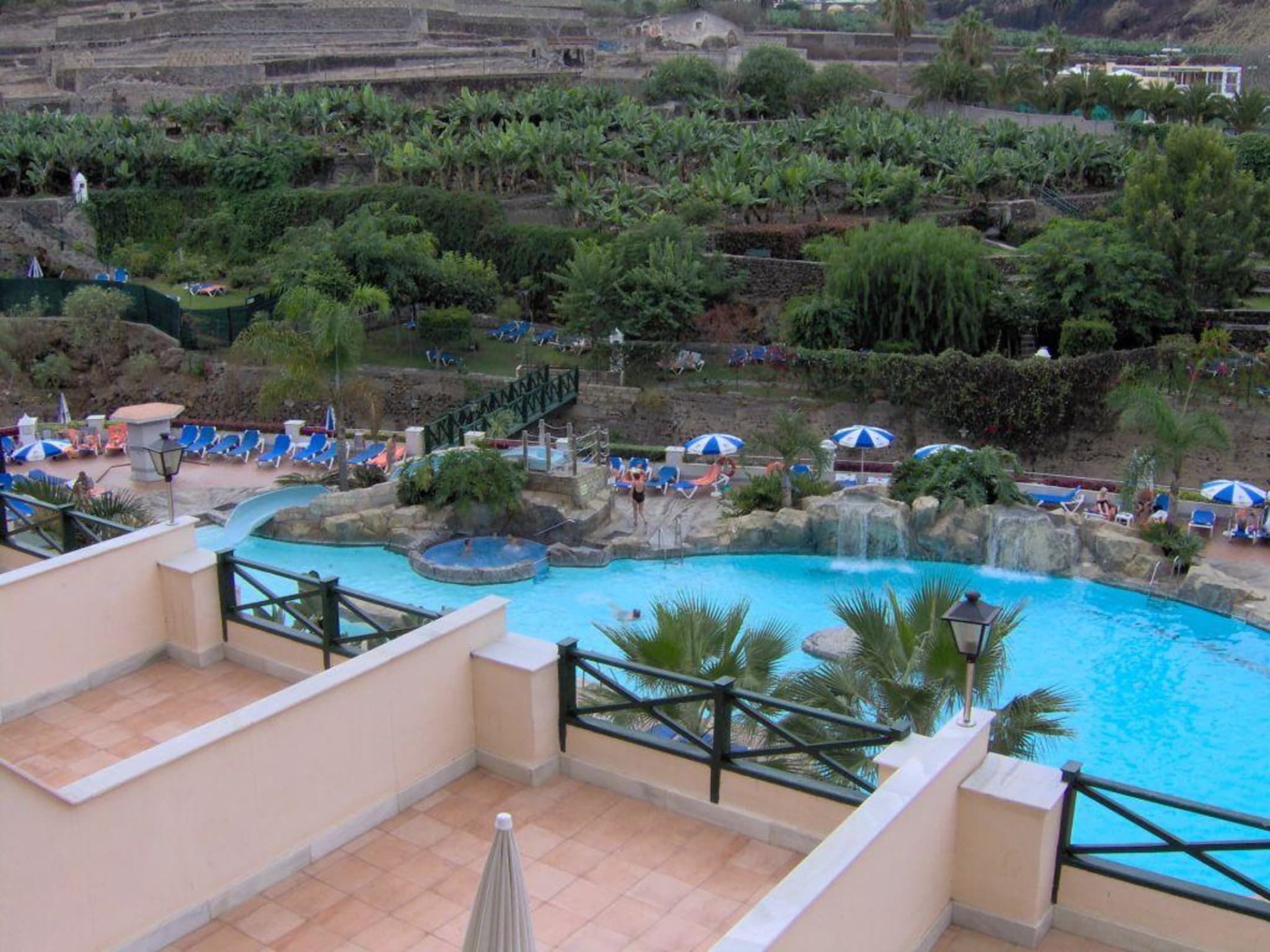 Blick vom Zimmer zum Garten und Pool