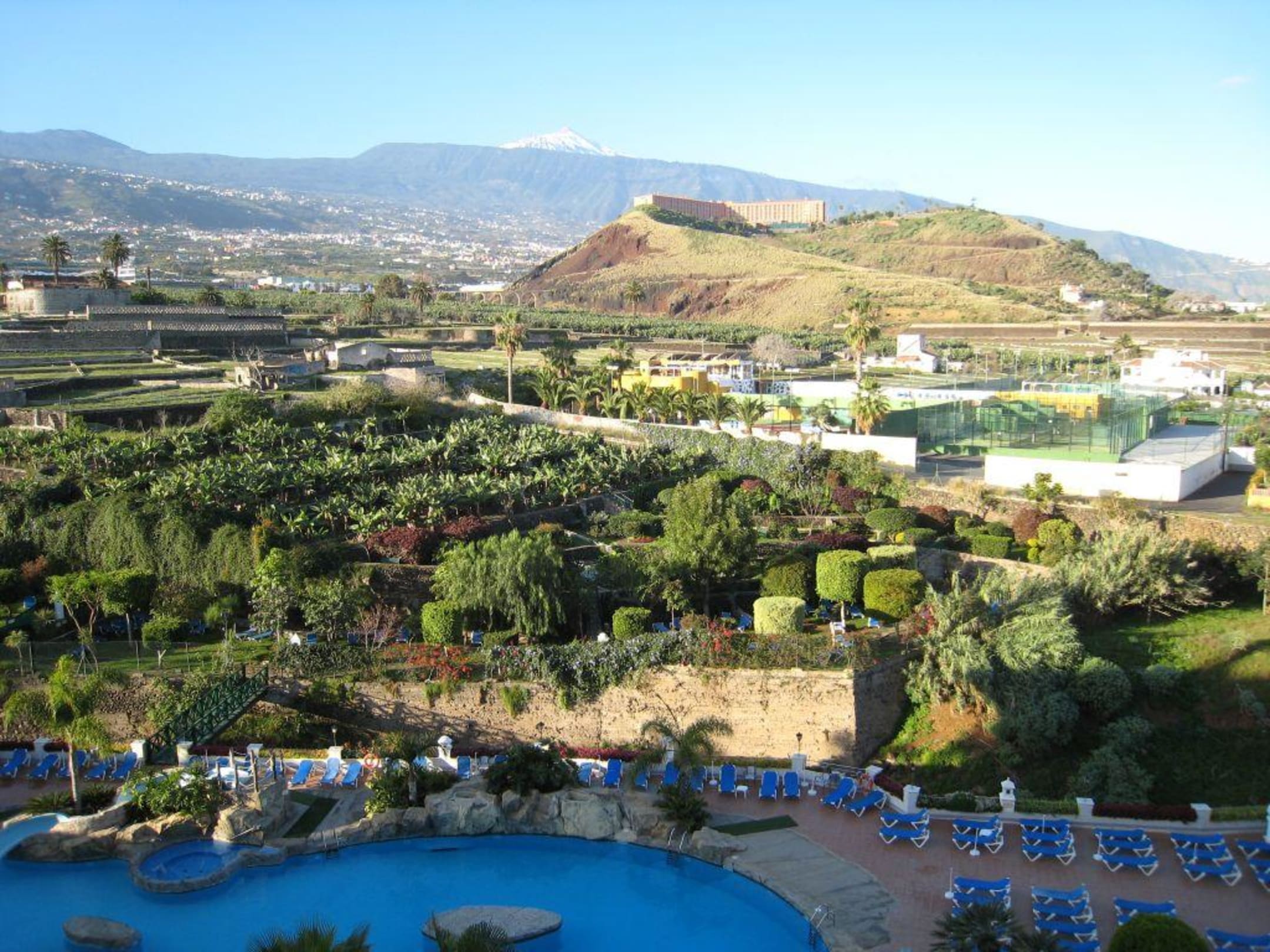 Blick aus der 4.Etage des Hotels Playa Canaria in Puerto de la Cruz auf Pool, Gartennalage und Teide am frühen Morgen