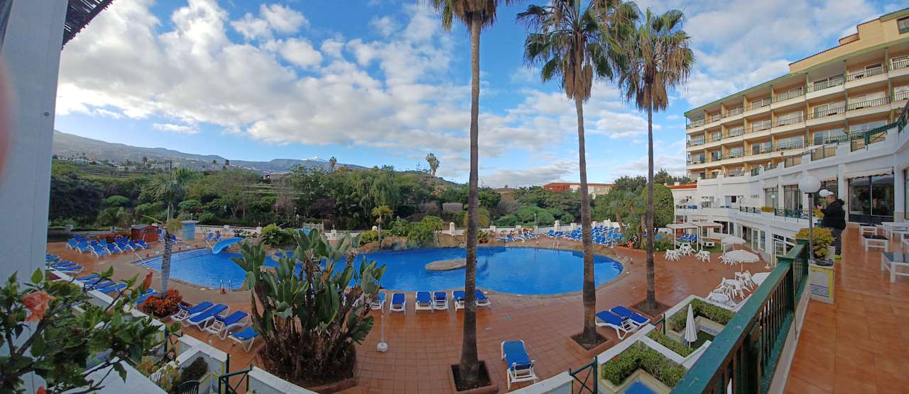 Panoramaaufnahme von der Terrasse auf den Poolbeteich