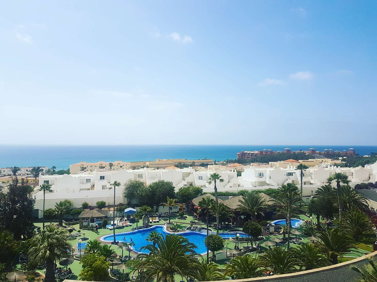 Blick vom Zimmer auf Poolanlage und Meer