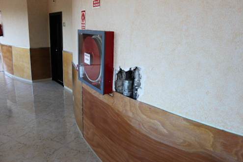 Offen gelegte Rohre im Flur der 4. Etage zwischen Zimmer 413 und 414.