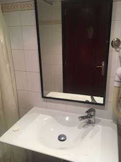 Bad - ganz hübsches Waschbecken, aber Duschvorgang und Tür (im Spiegel) gehen so nicht