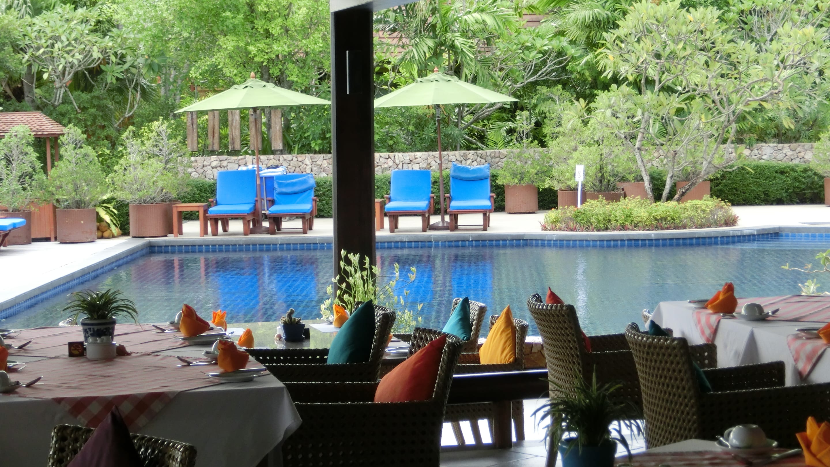 Blick vom Restaurant zum Pool