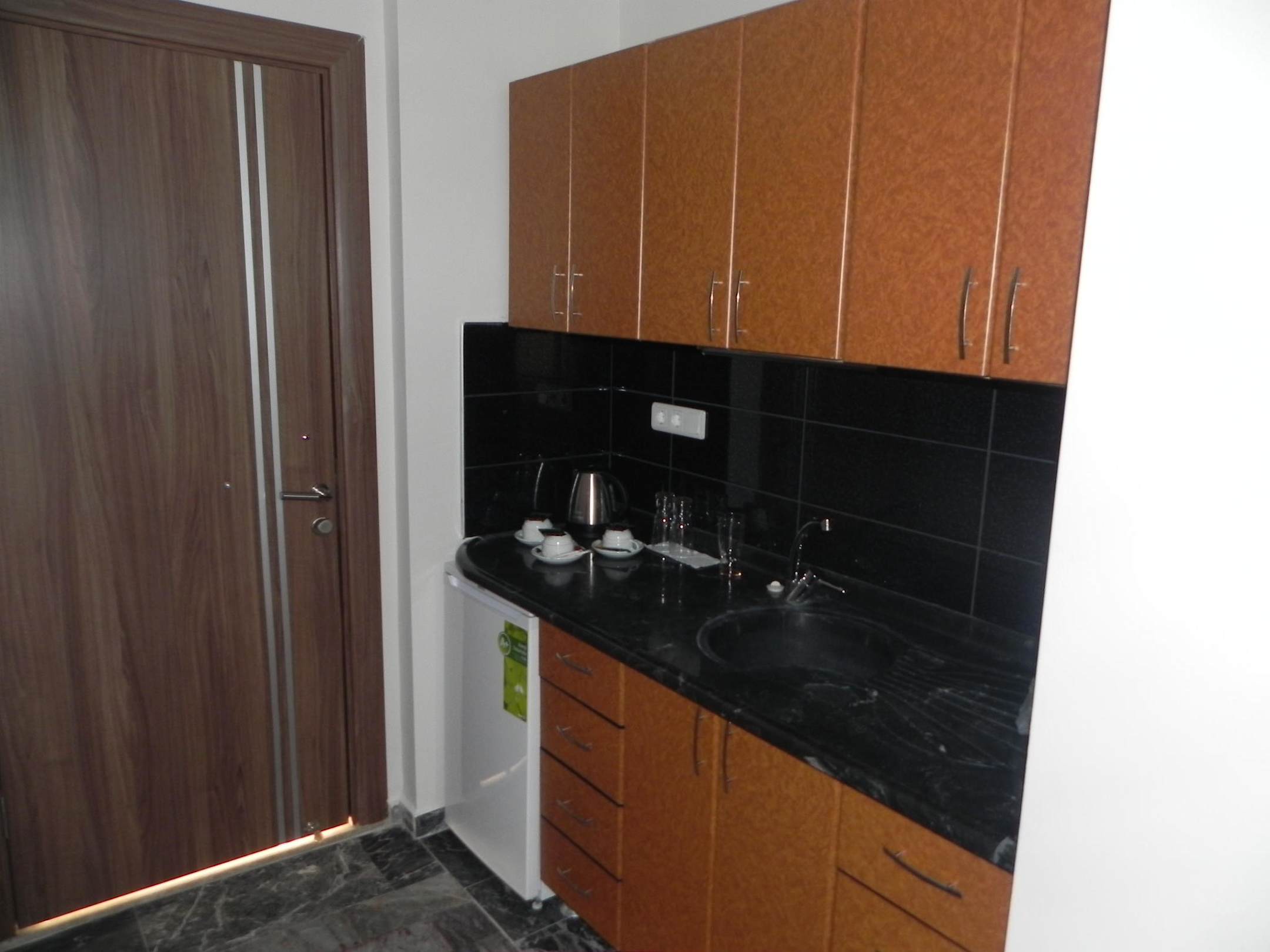 Kleine Küchenzeile mit Kühlschrank und Wasserkocher