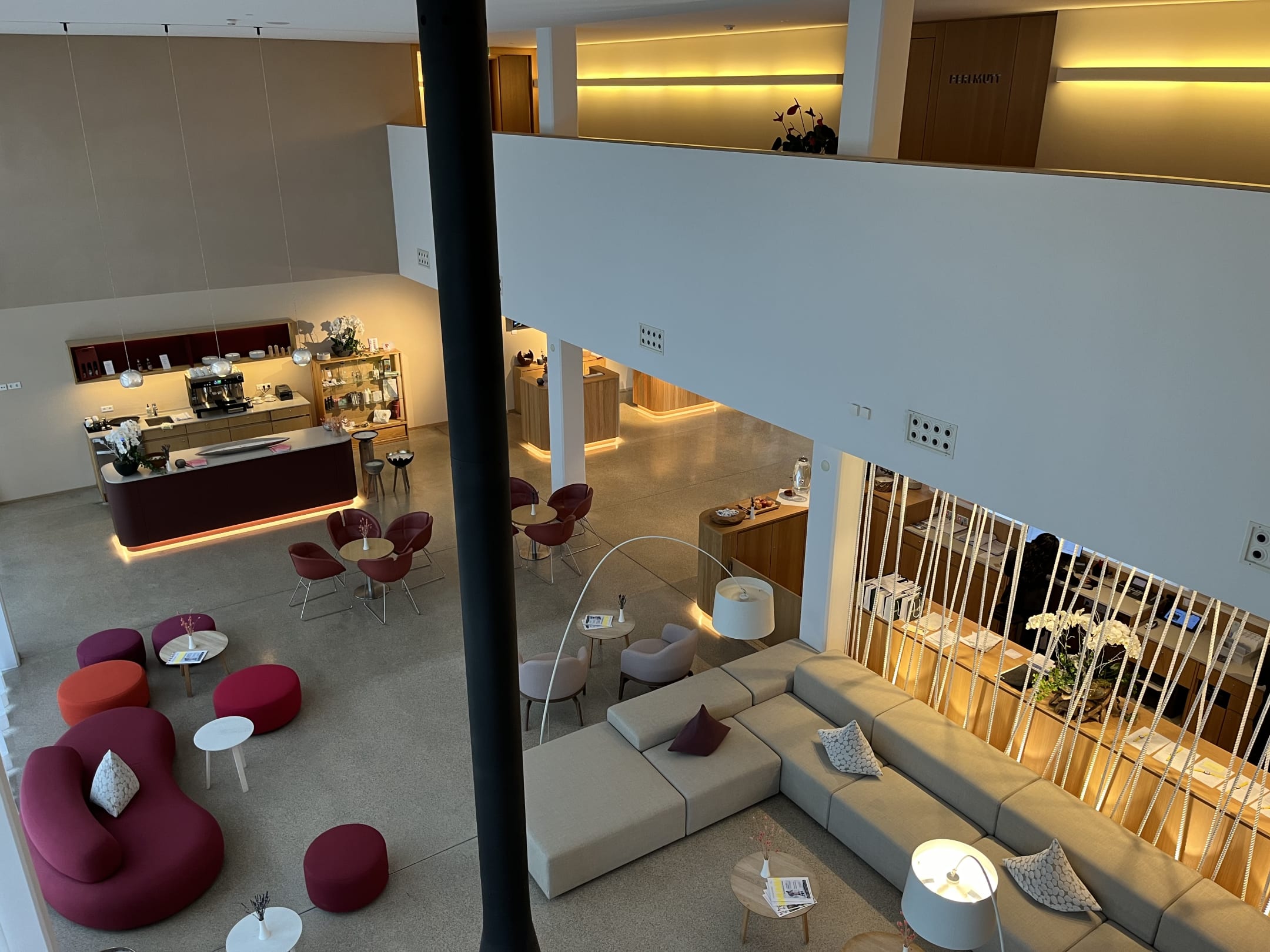 Blick vom Treppenaufgang in die Lobby mit Rückansicht Reception