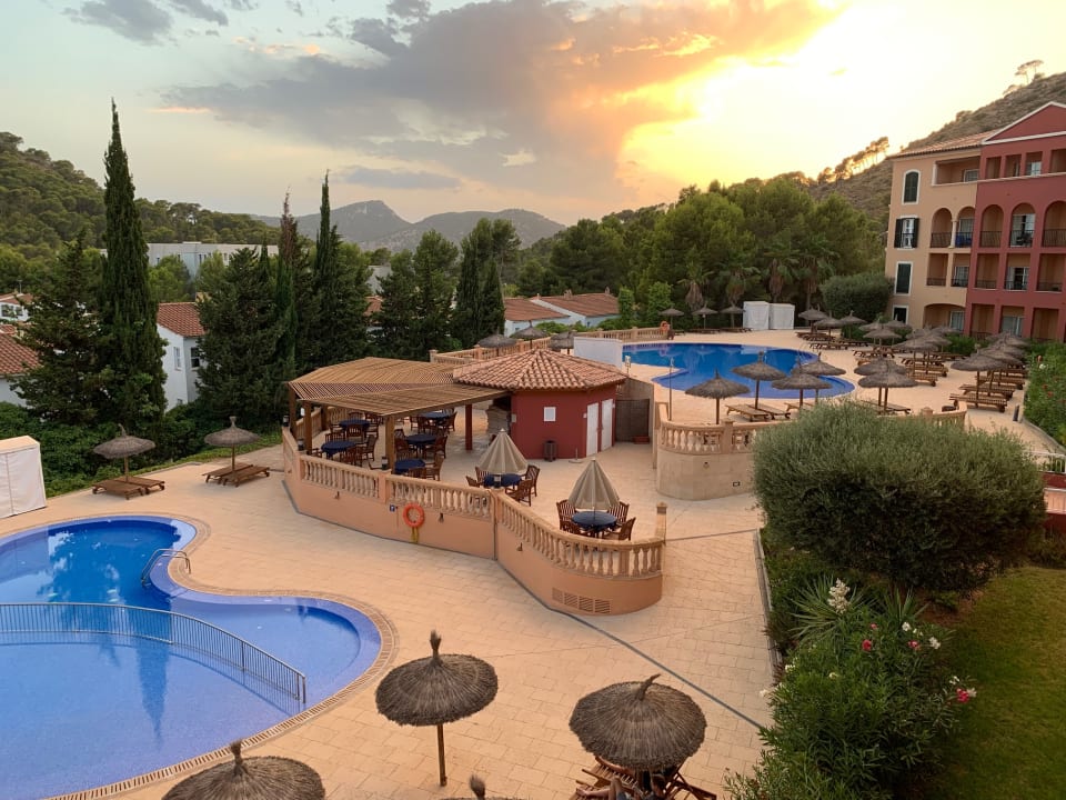Die Poolanlage bei Sonnenaufgang