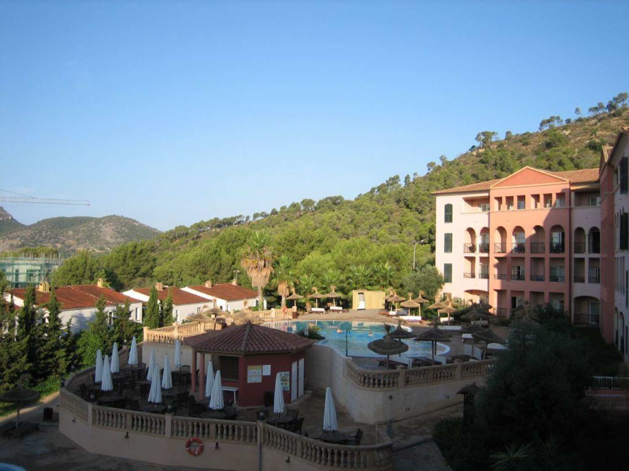 Blick vom Zimmer auf die Poolanlage