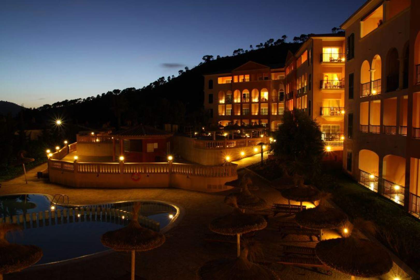Aufnahme des Poolbereichs vom Haus 1zeigt den kompletten Poolbereich, sowie das Haus 3 (gerade) und Haus 1 (rechts).