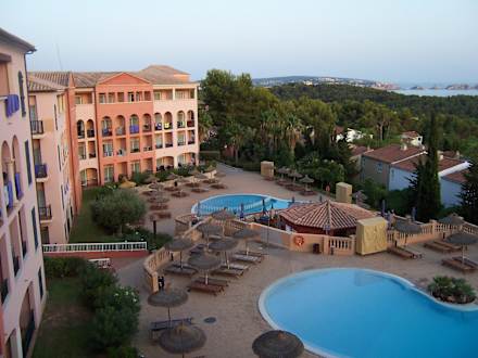 Blick vom Balkon auf den Poolbereich
