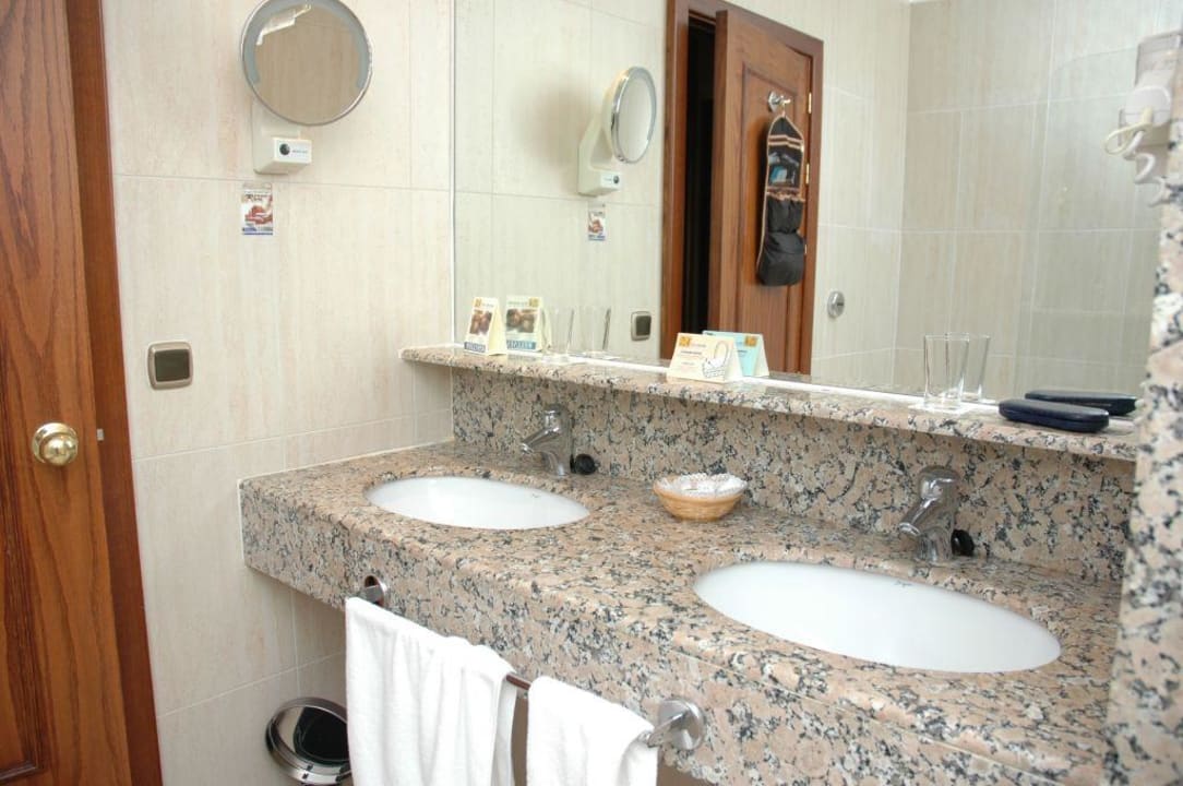 Hinter den Waschbecken befindet sich eine Badewanne (Im Spiegel zu ahnen) Rechts neben den Waschbecken ist noch das WC und dem gegenüber die Dusche.