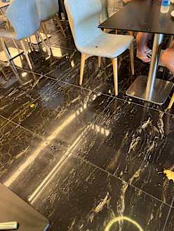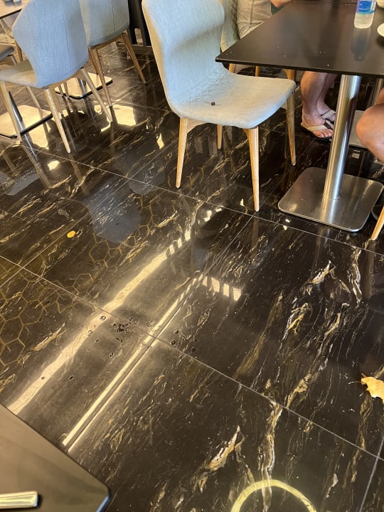 Oliven Semmelbrösel auf den Stühlen der Pancake, der ewig auf dem Boden liegt und vom Personal nicht gesehen werden möchte und man lieber drüber steigt