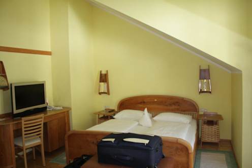 Zimmertyp 'Gala'Blick vom Sofa auf die Schlafseite. Die Nachtischen entpuppten sich als sher dekorative Leuchten.