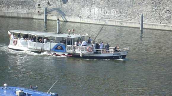 Raddampfer auf der MoldauVom Restaurant war der rege Bootsverkehr schön zu beobachten. Hier ein alter Raddampfer mit Dampfmaschinenantrieb.