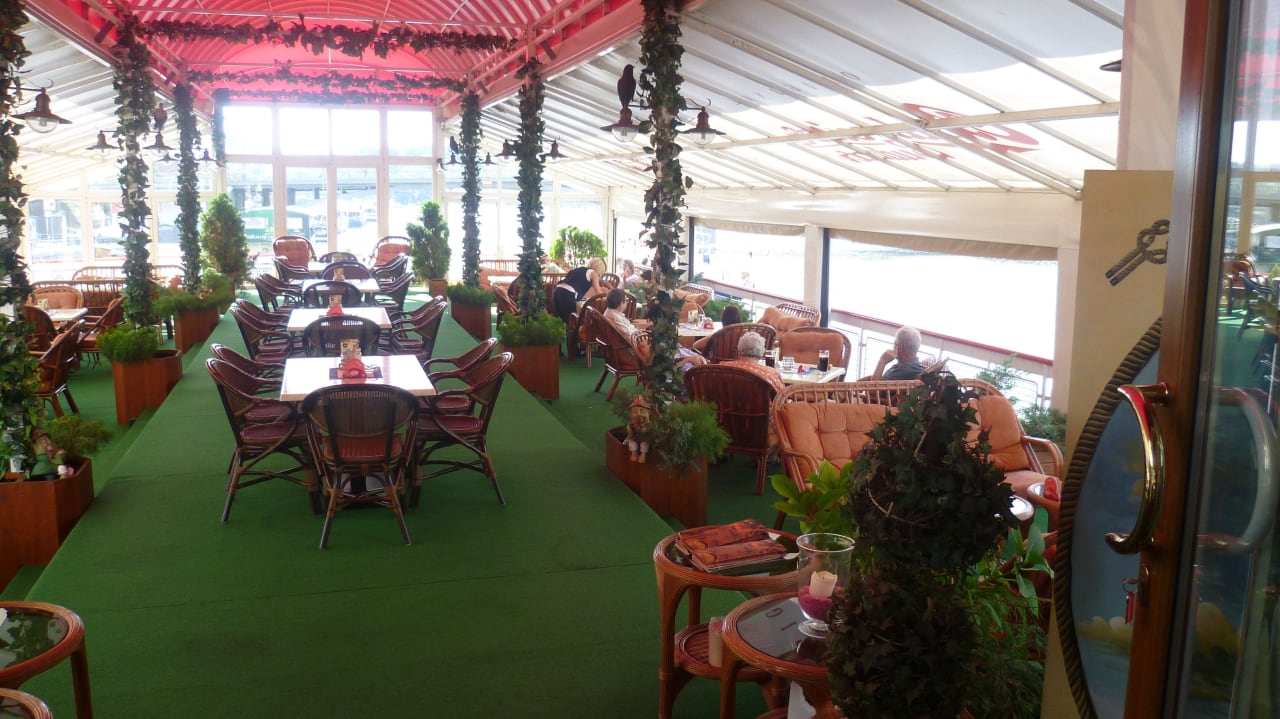 Unser Lieblingsplatzder schönste teil des Oberdecks, der seitlich offene Teil des Restaurants mit seinen angenehmen Sitzgelegenheiten. Von dort konnte man die in der Abenddämerung verschwindene Stadt, mit den beleuchteten Sehenswürdigkeiten (Prager Burg) betrachten.